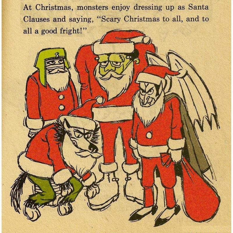 As for the text, well, it’s what you’d expect for something aimed at elementary readers. The following are examples, the first being advice from How to Care for Your Monster, the second a joke from Monster Jokes and Riddles, and the last an image from Monster Holidays showing our friends getting into the Yule spirit: